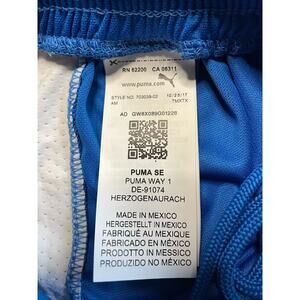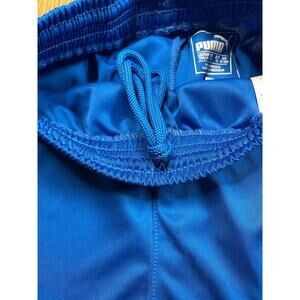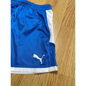 New with tags athletic shorts from Puma, Youth Small. Blue shorts with white details and mesh paneling, elastic waist with inner drawstring. Made with dry cell technology to wick sweat and keep kids cool during any game or play time.