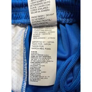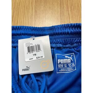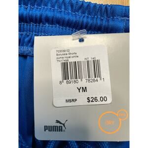 New with tags blue and white Borussia training shorts from Puma, size youth Medium. Lightweight shorts with dry cell technology and mesh panels to keep kids cool and comfortable through any practice, game, or play. Elastic waist with inner drawstring.