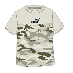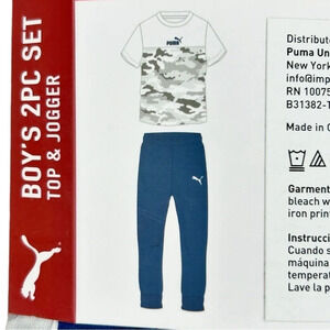 Elevate your little boy's activewear collection with this lot of two Puma outfits. The set includes two pieces, with one short-sleeve tee and one joggers in size 18M. The crew neck tees feature a Puma logo graphic, while the pants come with ribbed cuffs and a skinny leg style. Crafted from a lightweight and breathable jersey fabric, these outfits offer comfort and stretch for easy wear during walking, school, soccer, skateboarding, running, and jogging. The camouflaged and solid pattern and sporty Puma theme add a touch of style to the set. Machine washable for easy care, this outfit set is perfect for any season - winter, summer, fall, and spring.