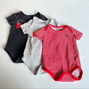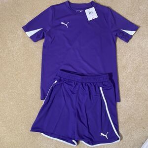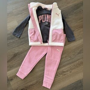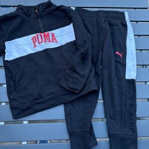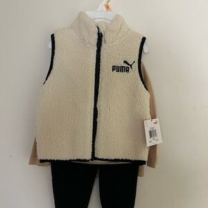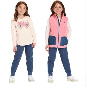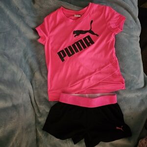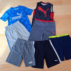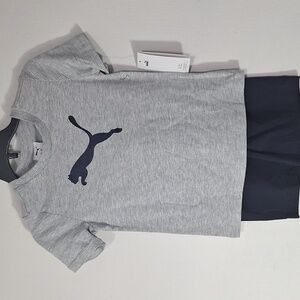20% off 3+ bundle! Trendy Puma set with a dark grey polo, gray t-shirt, and blue shorts with pockets and elastic waist. Ideal for active days. Active, outdoors, play, playtime, puma, polo, shirt, shorts, pockets, active waist, comfort, comfortable, lightweight, comfy.
