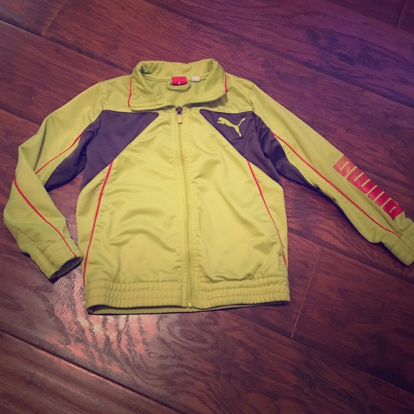 Awesome Fitted jacket from Puma size 5. Tons of detail throughout. Color is neon green with red stripe and logo on left sleeve. Fleece line inside. Excellent used condition, no flaws! He looked so cool with this jacket, jeans & a simple tee 💕