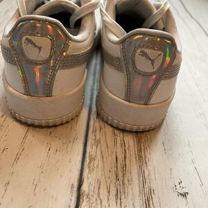 PUMA Carina white leather silver iridescent platform sneakers. EUC, low top, lace up, leather upper, Soft foam inserts. Style # 373834-01. No box included. Wear as noted in photos.