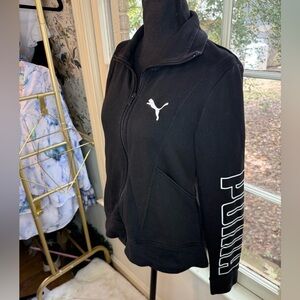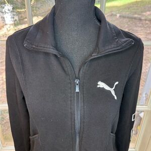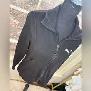 Stylish black zip-up jacket with Puma logo. Perfect for casual wear.