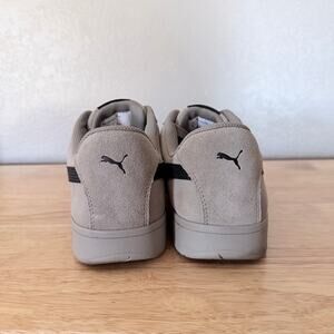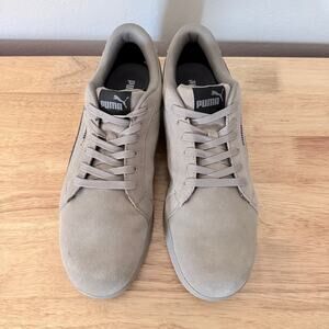 Men’s Puma composite safety toe work shoes in a neutral gray suede with black logo detailing. These are ASTM-rated with composite toe protection and slip and oil resistant outsoles, making them a solid option for warehouse, industrial, or food service work environments. Low-profile sneaker style keeps them looking clean and modern while still built for long shifts on your feet. Lightweight composite toe instead of steel for comfort, EH rated, and designed to meet safety standards without feeling bulky. Suede uppers show light wear and a few small marks consistent with normal use, visible in photos. Overall a great practical pair in a hard-to-find men’s size 15. Easy to style with workwear, cargo pants, or casual utility looks.