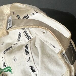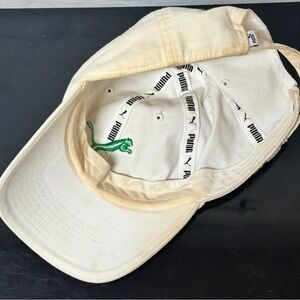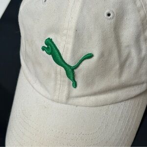 Stylish cream cap featuring a green Puma logo. Perfect for casual wear. Used good condition size men adjustable steamed before shipping