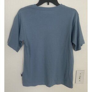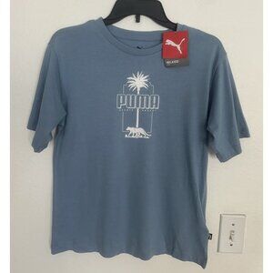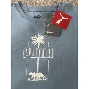 The Puma Essential Palm Resort Graphic Crew Neck Short Sleeve T-Shirt in women's XS size and blue color is a relaxed fit top made of cotton, perfect for casual occasions in the summer, fall, and spring seasons. This pullover shirt features a solid pattern, crew neckline, and short sleeves, and is adorned with the Puma logo accents. Easy to care for with machine washable instructions, this t-shirt is a stylish and comfortable addition to any woman's wardrobe.