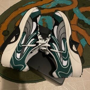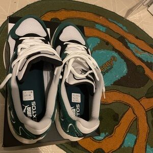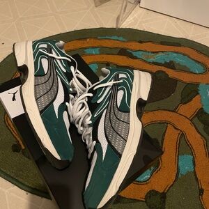 These Puma sneakers feature a striking green and white color scheme, perfect for making a statement. With a retro-inspired silhouette and cushioned sole, they offer both style and comfort. Ideal for casual outings, these sneakers are a must-have for any shoe collection. In very good, like new condition, with OG box.