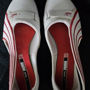 Stylish Puma sneakers with Ferrari branding. White and red color scheme. Iconic design with logo accents.