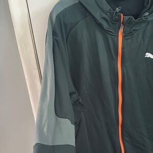 Puma hoodie in forest green. Bright orange zipper adds contrast. Includes hood and signature logo.
