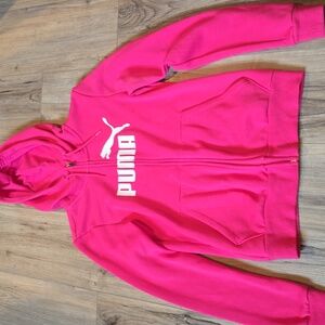 Bold fuchsia Pink hoodie with Puma logo. Features front pockets that are nice and big and zip closure. On the end of the zipper, it also says Puma. This is Nwot never been worn. It's such a cute hoodie. Nice and warm. I love how the zipper goes nice and high it protects the neck. it has a drawstring around hood, and on each end, it says puma.