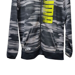 Puma Full-Zip Hoodie Sweatshirt in size Large for men is a stylish and comfortable activewear piece perfect for winter, fall, and spring seasons. Made from a blend of polyester and cotton, it features a striped pattern in gray color, with long sleeves and a drawstring closure. The hoodie also includes a graphic print of the Puma logo, a hood, and pockets for added convenience. Ideal for walking, running, and jogging activities, this Puma Classics hoodie offers an athletic fit for a casual and sporty look.