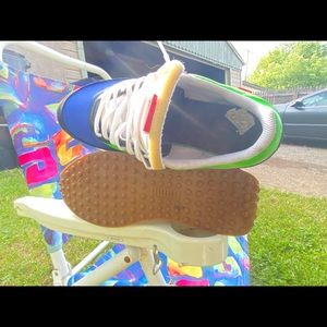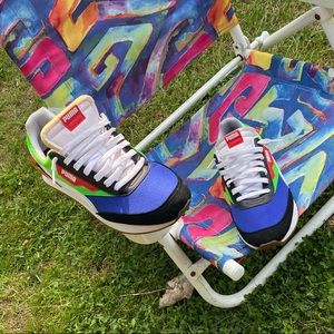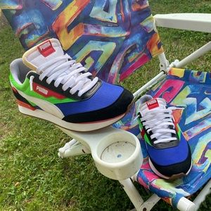 Red Blue, dash of pink, and green complement eachother on these lovely sneakers presented by Puma. Narrow design for the sole/foot.