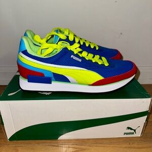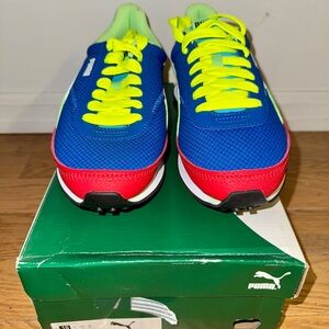 Bright blue sneakers with neon yellow laces and red details. Features a bold design with green and white accents. Never worn.