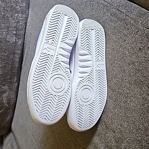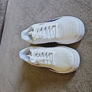 White leather uppers with a prismatic rainbow effect on the trim. These are size 7C, which I believe is technically a child's size, but they can fit an adult foot. I really wanted these to work for me, but they're slightly too small for my size 7.5-8 foot. Never worn except to try on in the house once they got to me. Shoe box not included. Please look at all photos and note the size as it is part of the description.