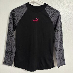 Black shirt with gray graffiti-print sleeves and pink Puma logo