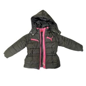 Puma Girls Puffer Hooded Jacket Size 4 Pockets Zip-Up Black & Pink