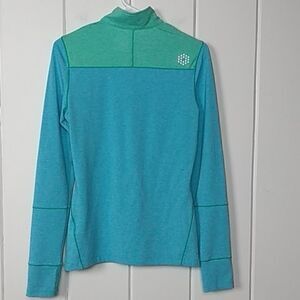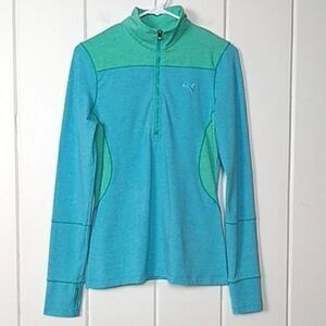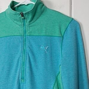 Puma green & teal golf 1/2 zip lightweight jacket. Size - Small. 75% polyester, 13% cotton, 12% elastane. Puma cat logo on front lapel. Thumb holes on both sleeves. driRelease® and DryCell Technology. DryCell technology draws sweat away from skin helping to keep you dry. Super cute top / jacket in great shape!