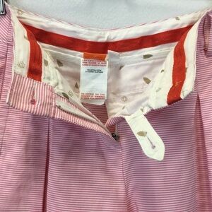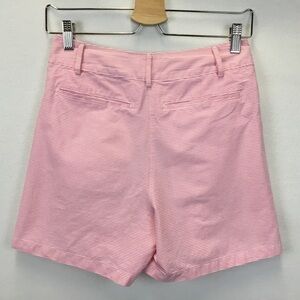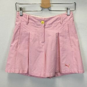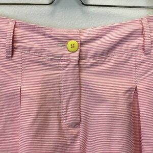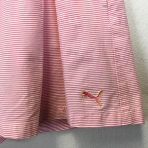 Puma Golf Pleated Striped Shorts. Color: Pink and white. Single yellow button.