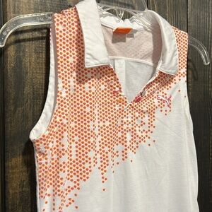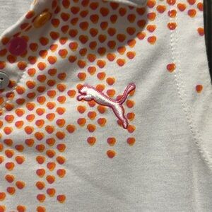 Puma sport collection sleeveless polo top. Size small. White with pink & orange dots / button detail. Stretch material. Great for golf & tennis. Spring & Summer. Preloved. Please see all photos for condition.