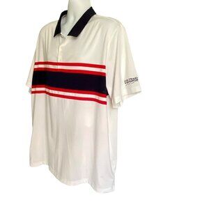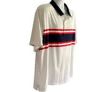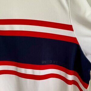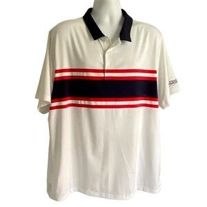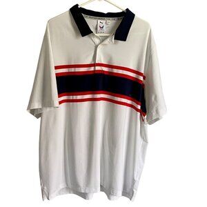 Puma Golf Volition America Polo Shirt with United We Stand in blue on blue stripe on cheat and River Strand Golf and Country Club on Sleeve. 91% Polyester, 9% elastane. Men's Size XXL with Approximate measurements laying flat: 27" pit to pit, 31" length , 11.5" sleeve length.