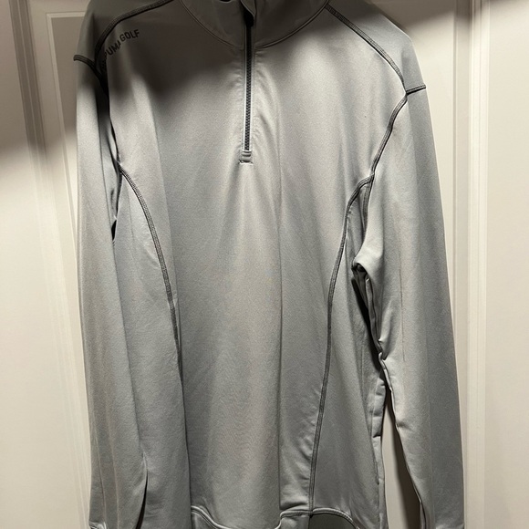 Experience the perfect blend of style and functionality with the Puma Gray Lightweight Performance Jacket. Crafted from smooth, synthetic fabric, this jacket offers a relaxed fit and features a high collar with a quarter-zip closure. Ideal for athletic pursuits, its paneled construction ensures both comfort and durability.