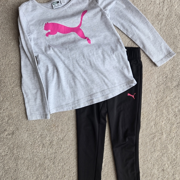 Stylish Puma outfit featuring a gray long-sleeve top with a pink logo and black leggings. Perfect for casual wear.