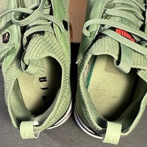 Stylish Puma athletic shoes. Features green mesh upper. Black accents and white sole. Perfect for workouts.