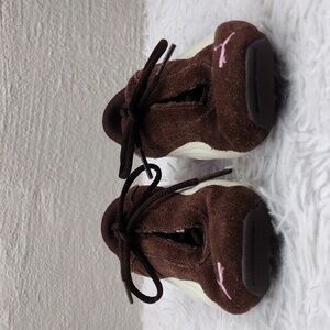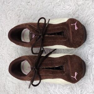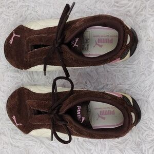 Puma Growth Control System Toddler Girl's Brown Pink Suede Leather Upper Round Toe Low Top Four-Eyelet Lace Up Sneakers. Rubber Sole. Pink White Leather Upper Side Stripe Detail. Embroidered Pink Upper Toe Logo. Light Upper Suede Wear. Size 10