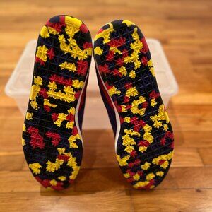 The outsole has a multi‑color pattern — yellow, red, and black — in a star / hex-like textured grid pattern.