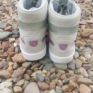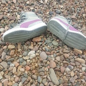 Worn once, Puma hi-tops. Gray with purple, there's a set of gray and purple shoelaces. Size 9 mens, 10 womens. Cute and clean, please see pics.