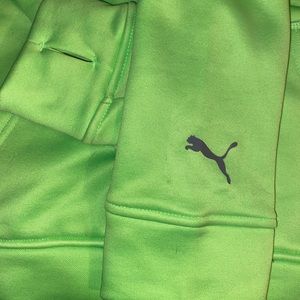 Neon green with contrasting camouflage Puma logo and hood interior. This great hooded sweatshirt features a grey Puma logo at the left wrist and thumbholes!