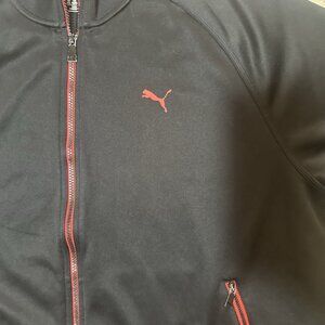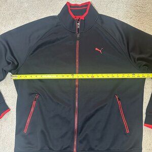 Puma black track jacket with red logo and detail in men’s size 2XL. Zip up closure and two front zipper pockets. Has some light pulls on sleeve and small pull in back. Hard to see. In good condition.