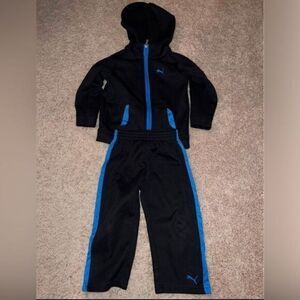 Keywords: Puma, kids tracksuit, hooded jacket, sports pants, black and blue, athletic wear, children's sportswear, zip-up hoodie, activewear, casual outfit