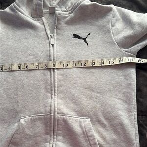 Keep your child cozy with the Puma Kids Gray Hoodie Jacket. This stylish gray jacket features a comfortable fit and a classic design, perfect for everyday wear. The Puma jacket only has a few small stains on the sleeve, but everything else is in perfect condition.#p599
