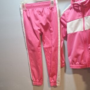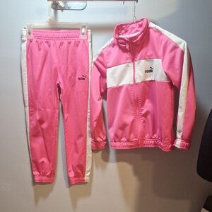 Vibrant pink Puma set with white stripes. Includes jacket and pants. Perfect for active kids.