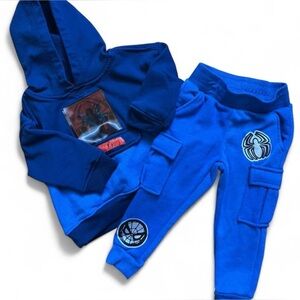 Vibrant red top with iconic logo. Black shorts with red stripes. Perfect for active play.