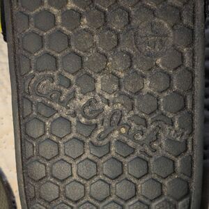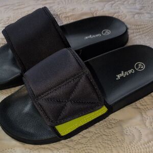 Comfortable Puma slides for kids. Easy slip-on design. Some scuffing on front and bottom. Plenty of wear left.