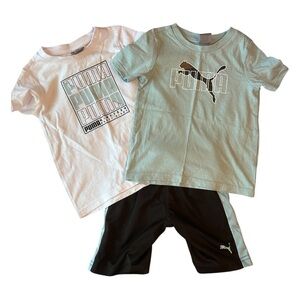Stylish Puma set with two graphic tees and shorts. Ideal for playtime.