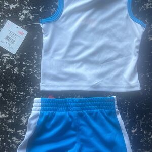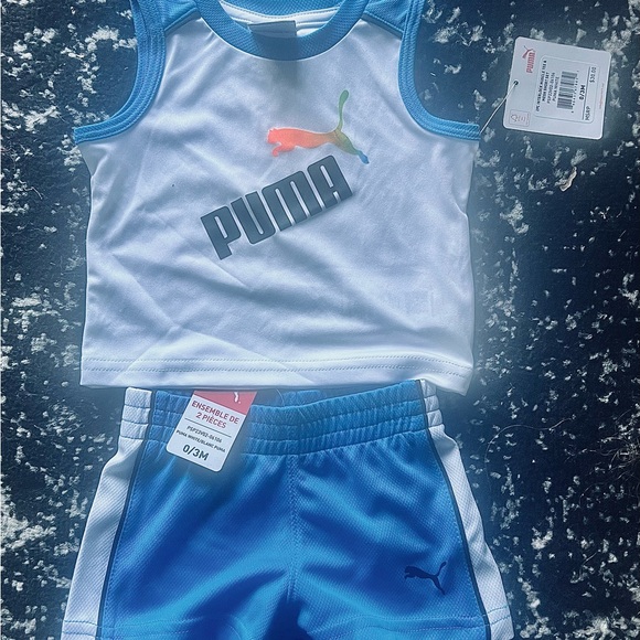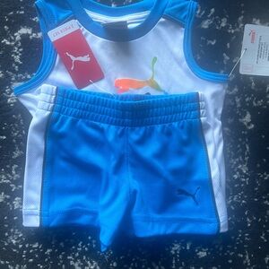 Puma kids' athletic set with a white tank top and blue shorts. Ideal for playtime. Spring, summer, and fall apparel. Brand New! NEVER BEEN WORN! Comes from a smoke free facility. Size 0/3 months. Very cute for your little baby boy. You can pair this outfit with sneakers or sandals. This will be a great addition to his wardrobe. Original price $30. Great deal on the set. Only ship with in the United States. NO RETURNS! I am very honest about all my items that I sell from my shop. If you have any questions please feel free to contact me. Thank you for looking.