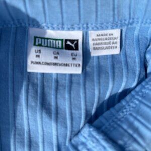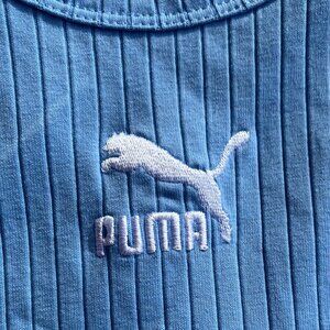 Ribbed light blue dress has white embroidered Puma logo, racer back straps. In excellent condition.