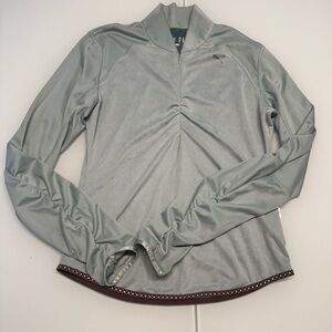 Stylish Puma long sleeve top. Light blue/gray color. Perfect for casual wear or sports. Has ruching on back of sleeves and thumb holes