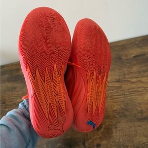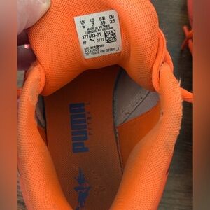Pre-owned pair of Puma MB.02 Supernova basketball shoes, a collab with NBA player LaMelo Ball. These are a men’s size 7 and finished in a bright orange color with blue accents. They’ve got a mesh upper with no-sew overlays, a TPU heel clip with LaMelo’s Wings logo, and Puma’s Formstrip on the side.