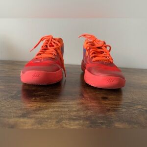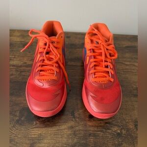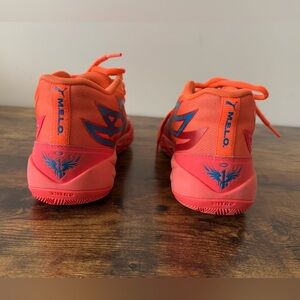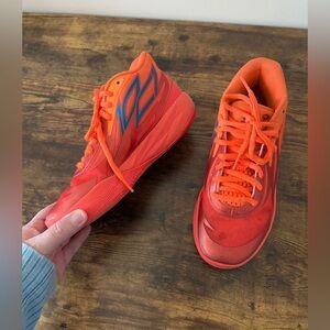 Pre-owned pair of Puma MB.02 Supernova basketball shoes, a collab with NBA player LaMelo Ball. These are a men’s size 7 and finished in a bright orange color with blue accents. They’ve got a mesh upper with no-sew overlays, a TPU heel clip with LaMelo’s Wings logo, and Puma’s Formstrip on the side.