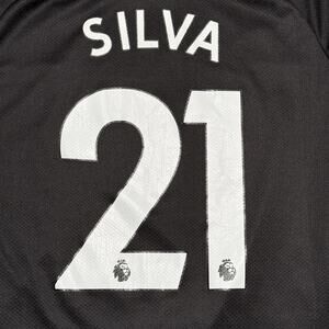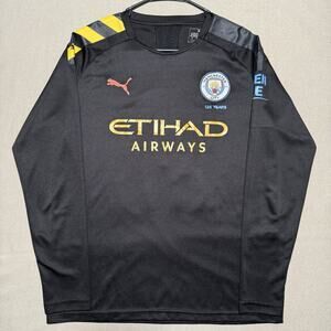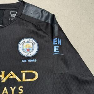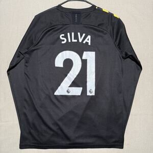 Used in very good condition with little signs of use. The lettering for the size tag and “Manchester” text along the next have started to peel off. Otherwise no stains, rips or blemishes of any kind. The product is a Puma Manchester City away jersey for the 2019-2020 season, featuring David Silva's number 21 on the back. This officially licensed soccer jersey is in size M and comes in a sleek black color with long sleeves and commemorates the 125th anniversary of the club. Perfect for any Manchester City fan looking to show support for their favorite team and player on the pitch or in the stands. Measurements are listed below as well as in the photos.