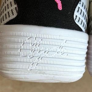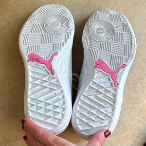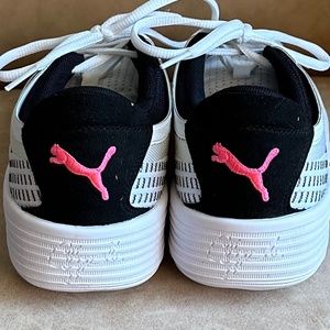 Puma Men's Clyde All-Pro Basketball Sneakers -White/Black with Pink Logo - Size 7.5 Men's/9 Women's - Athleisure. These Puma Clyde All-Pro Sneakers feature a unique stitched pattern with the latest in comfort technology, including a Pro-Foam+ high-rebound EVA midsole, seamless lightweight and durable woven upper providing enhanced stability and support, PUMA Formstrip design at lateral side, suede heel cap with embroidered PUMA cat logo, woven PUMA label at tongue, padded mesh tongue, lace up closure, and rubber outsole. Excellent condition - LIKE NEW!