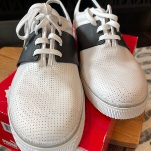 Sleek Puma sneakers with perforated design. New in original box. White upper with black accents. Stylish and comfortable for everyday wear.