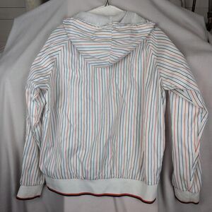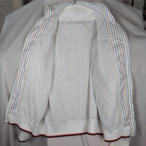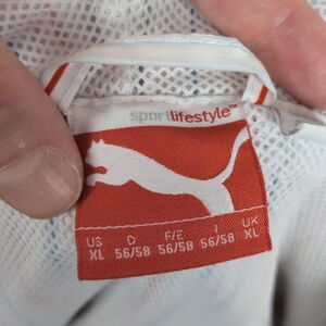 White, red, and blue Puma zip front windbreaker jacket. It has two front pockets and a hood. Lightweight. #sportswear #athletic #puma #tracksuit #retro