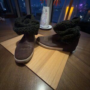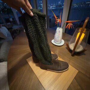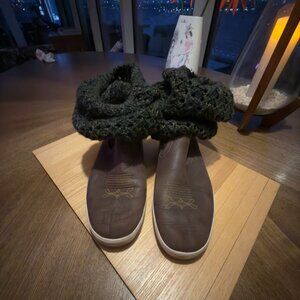 Stay stylish and cozy with these unique Puma sporty mid-season boots, combining sneaker comfort with a boot silhouette. Featuring a brown leather base with embroidered details and a soft green knit cuff that can be worn up or slouched down, these versatile boots are perfect for transitional weather.