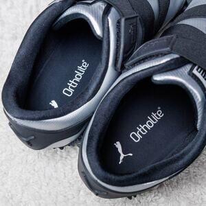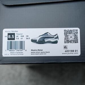Puma Mostro Metal Silver Black Leather Sneakers Womens Size 10 Mens 8.5 Leather and synthetic upper. Excellent condition - see pictures for wear. Worn once, comes with original box. Runs small, size up half size.