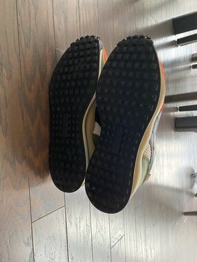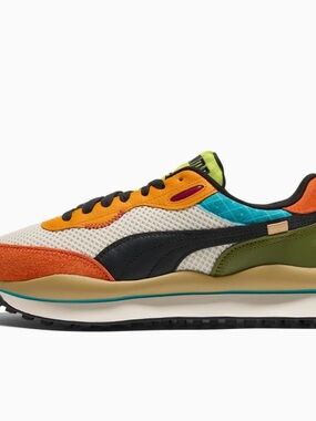 Retro-inspired Puma sneakers with bold colorblocking. Orange suede overlays and cream mesh panels. Black formstripe and laces for contrast. Lime green tongue and teal accents add energy. Cushioned midsole with textured outsole for traction.